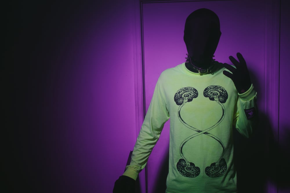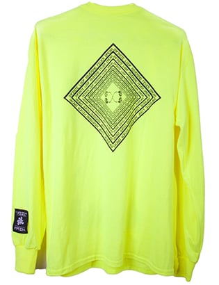 100% cotton day-glo yellow/green long sleeve tee, with oversized discharge printed front and back graphic. Branded wrist tags attached to left sleeve.