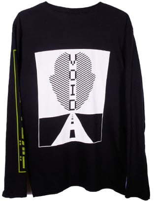 100% cotton black long sleeve tee, with oversized discharge printed front, back, and sleeve graphics. Branded wrist tags attached to left sleeve.